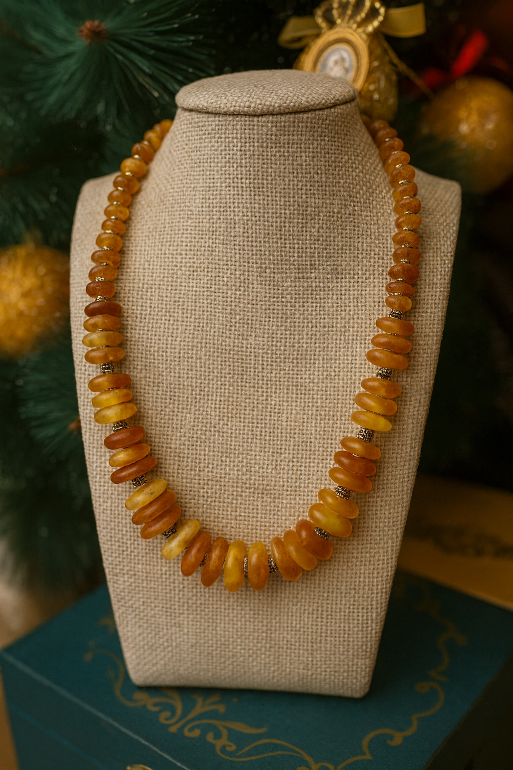 שרשרת אלגנטית זו עשויה מענבר בלט טבעי בגווני דבש חמים וקוניאק. כל חרוז נבחר ומלוטש בקפידה כדי להדגיש את התכלילים הטבעיים הייחודיים והזוהר הרך של ענבר אמיתי. הצורה המעוגלת והחלקה יוצרת עיצוב מאוזן ועל-זמני היושב בנוחות על קו הצוואר.