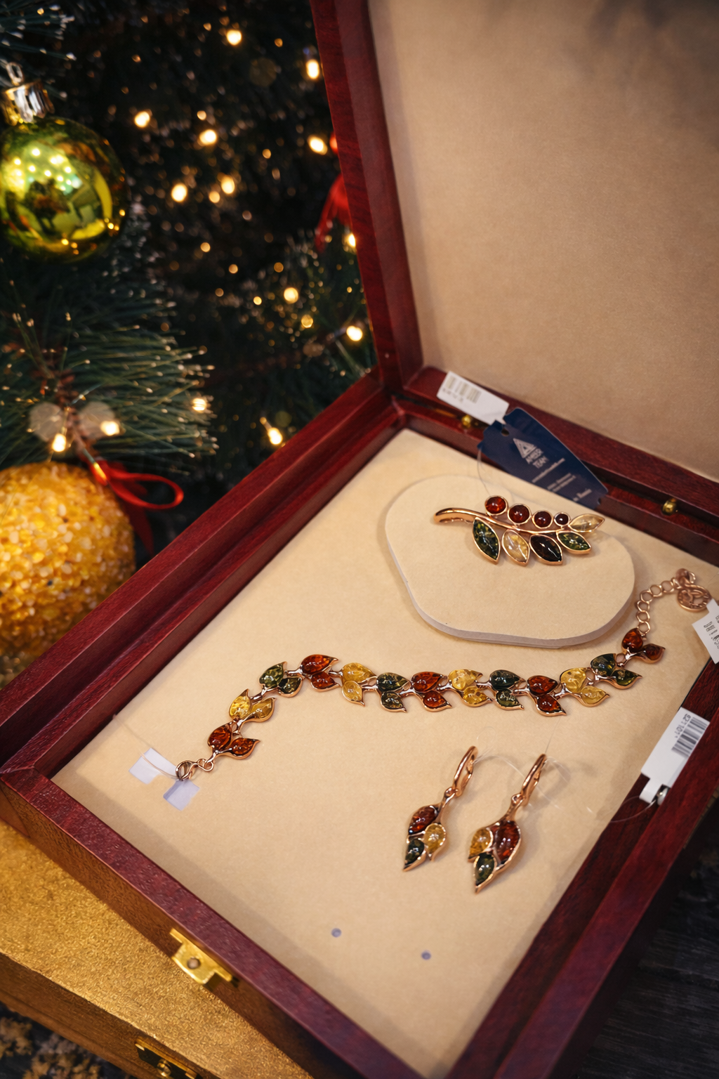 סט תכשיטים אלגנטי זה משלב צמיד, עגילים ותליון סיכה לעיצוב הרמוני אחד. עשוי מכסף סטרלינג 925 עם ציפוי זהב מעודן, כל פריט מעוטר בענבר בלטית אמיתית, המוערכת בזכות זוהרה החם ותוספותיה הטבעיות.