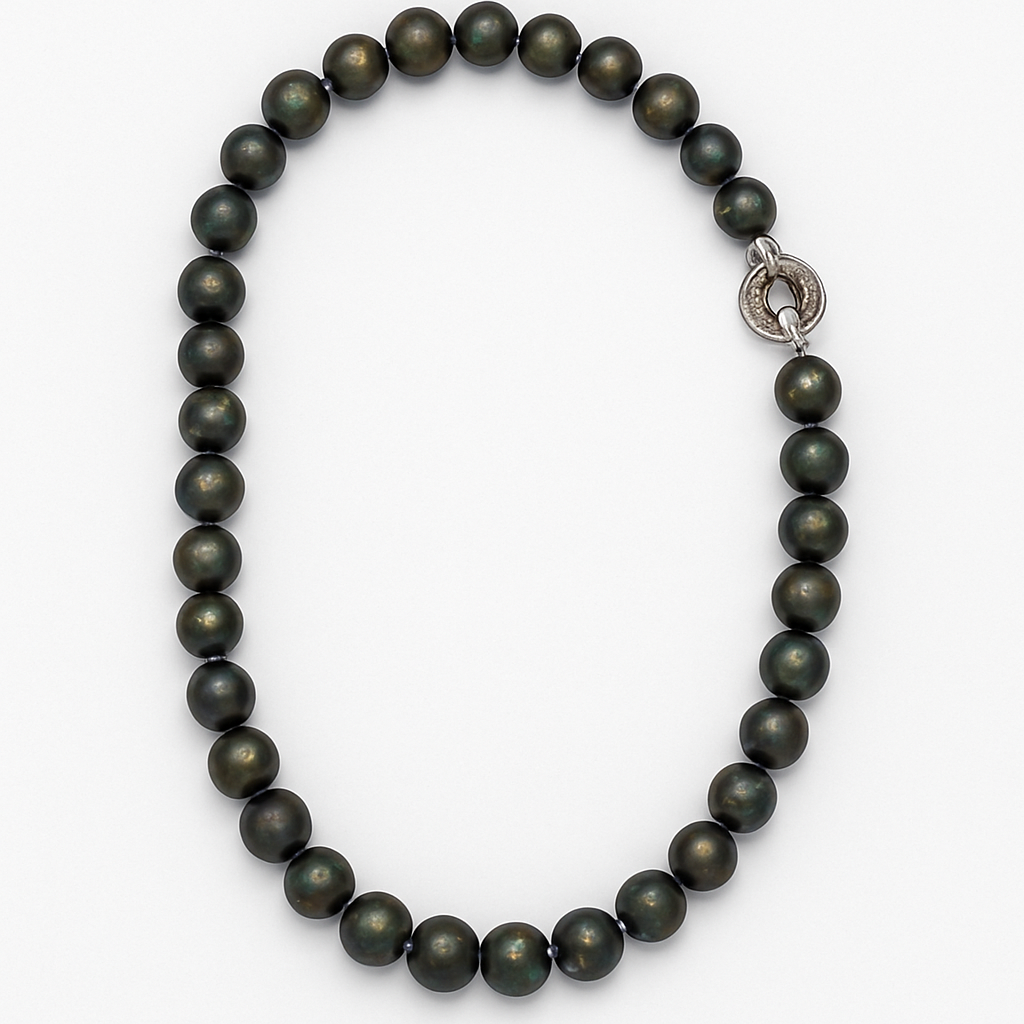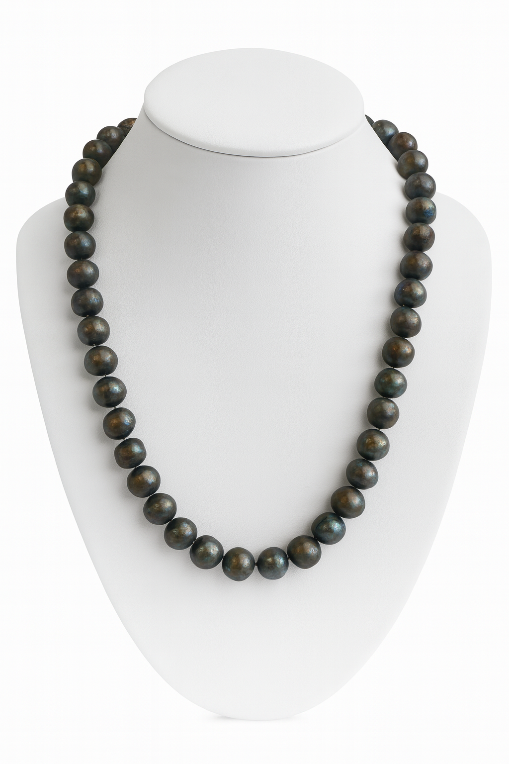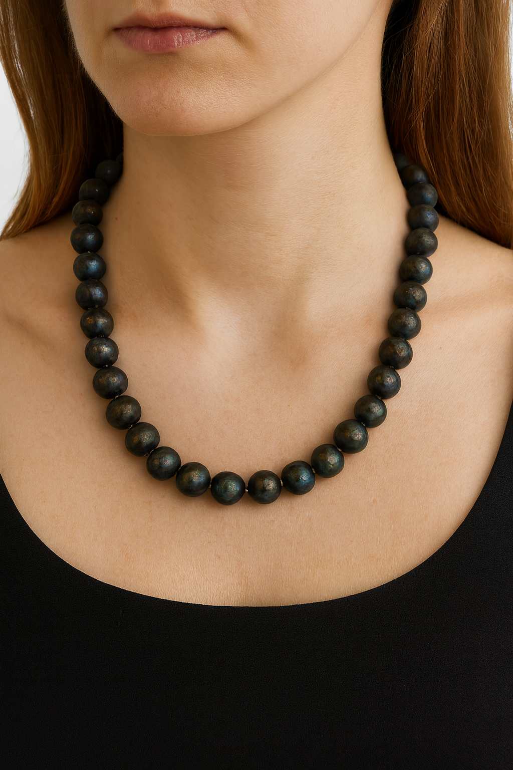 גלו את קסם הלילה עם שרשרת "זוהר חצות" שלנו, עשויה מפניני מים מתוקים שחורות טבעיות בגודל מרשים של 11-12 מ"מ . הברק העמוק והמסתורי שלהן משקף גוונים של ירוק, כחול וברונזה, ויוצר משחק צבעים שובה לב בכל תנועה.