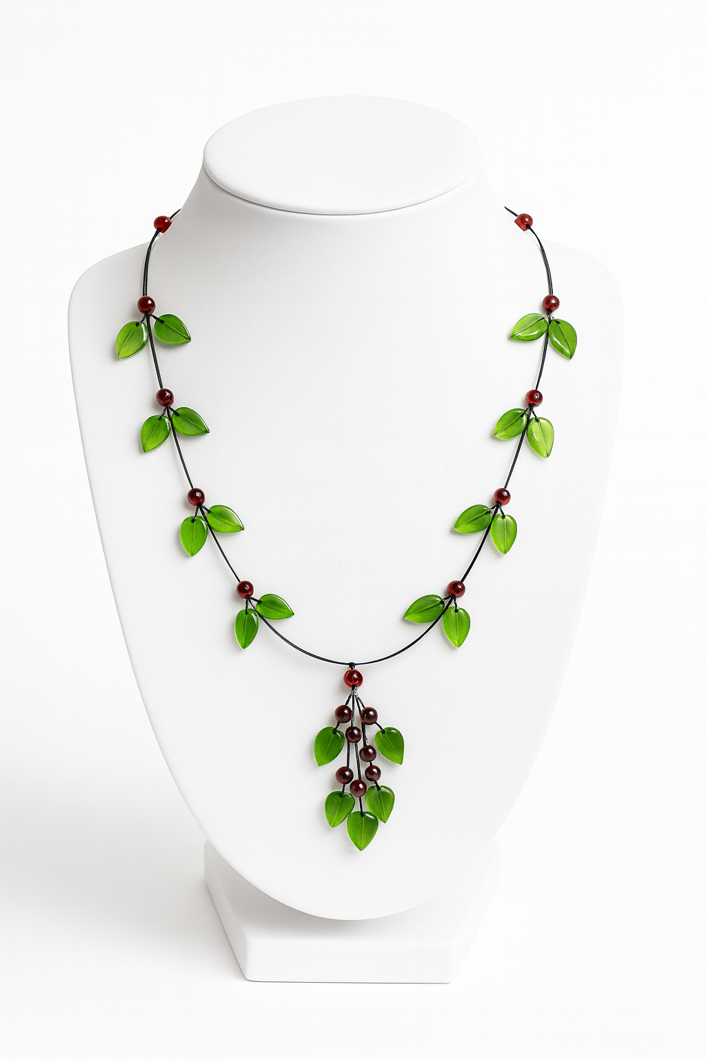 עלי ענבר קריביים ירוקים עדינים - משופרים בחום לייזר כדי להשיג את גוונם הזוהר והתוסס - משולבים עם חרוזי ענבר בלטיים בצבע דובדבן עמוק, ויוצרים ניגוד בולט של צבע ומרקם.