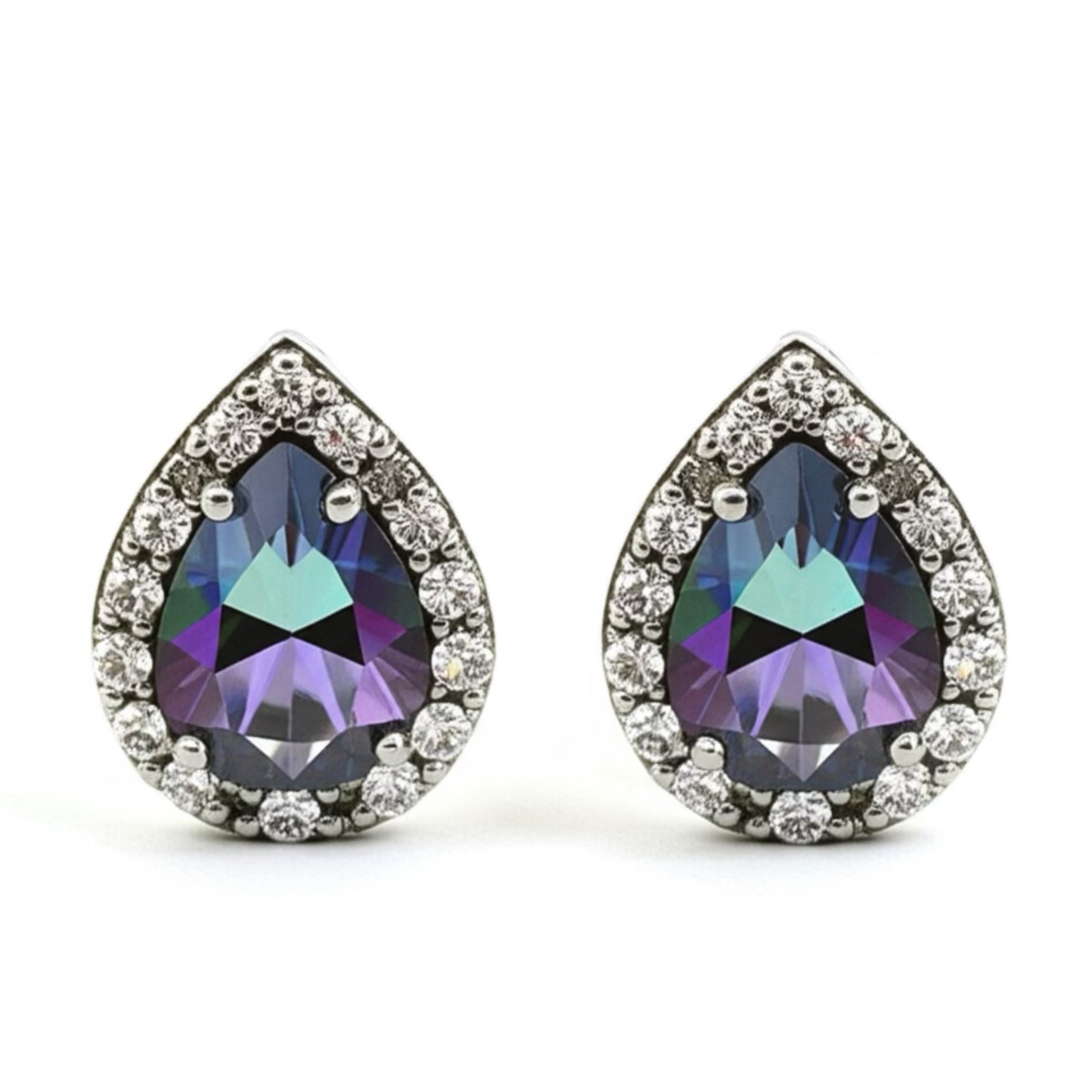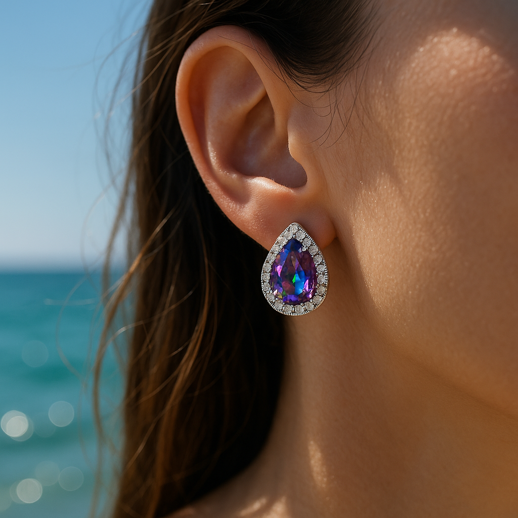 עגילי "הזוהר המיסטי" הם שילוב מרהיב של אלגנטיות ומיסתורין. עשויים מכסף סטרלינג 925 , כל עגיל משובץ באבן חן קוורץ מיסטי מסנוורת, המנצנצת בגוונים של סגול, ירוק וכחול. מוקפים בתוספות נוצצות, עגילים אלו, שגודלם 2 ס"מ, מקרינים ברק ועידון, תוך שמירה על משקל קל של 5 גרם . מושלמים לאירועי ערב, ארוחות רומנטיות, או כמתנה ייחודית למישהו מיוחד.