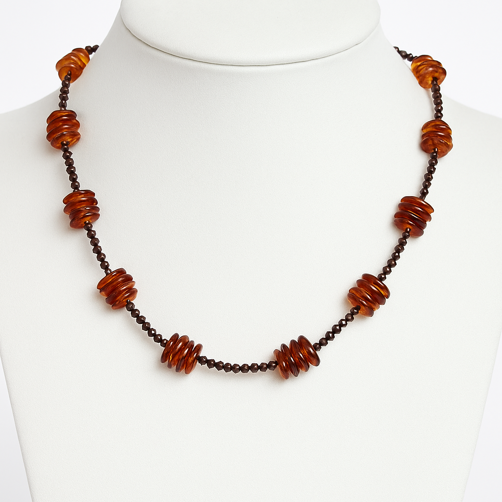 חרוזי אמטיסט קטנים מלוטשים מוסיפים נופך מעודן, בעוד שכדורי הענבר הגדולים יותר יוצרים נקודת מוקד חיה ויוקרתית.
