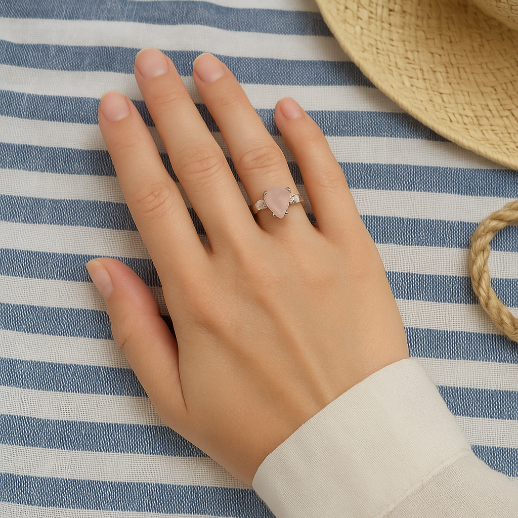 טבעת השלווה בצבע ורד קוורץ היא סמל לרכות ואלגנטיות נצחית. היא עשויה בעבודת יד מכסף סטרלינג 925 , וכוללת אבן חן ורודה רכה בצבע ורד קוורץ , המהוללת כאבן האהבה וההרמוניה . צבעה העדין ועיצובה הקליל במשקל 3 גרם הופכים אותה לאביזר מושלם ליום יום, בעוד שזוהר הרומנטי שלה מוסיף תחכום למראה ערב. תכשיט חינני להוקיר לעצמך או לתת מתנה באהבה.