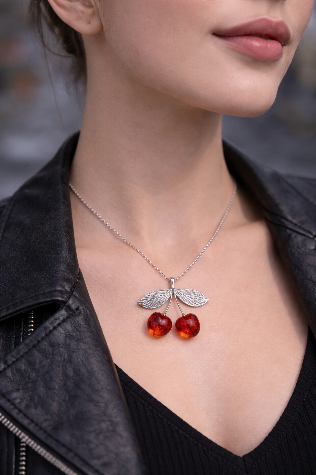 This elegant cherry brooch pendant is crafted from sterling silver and set with natural Baltic amber shaped into two glowing cherries. The rich amber tones create a warm depth and natural character, making each piece truly unique. The design can be worn both as a brooch and as a pendant, giving you versatility in styling. A refined yet playful jewelry piece that adds character to everyday looks and becomes a striking accent for special occasions.