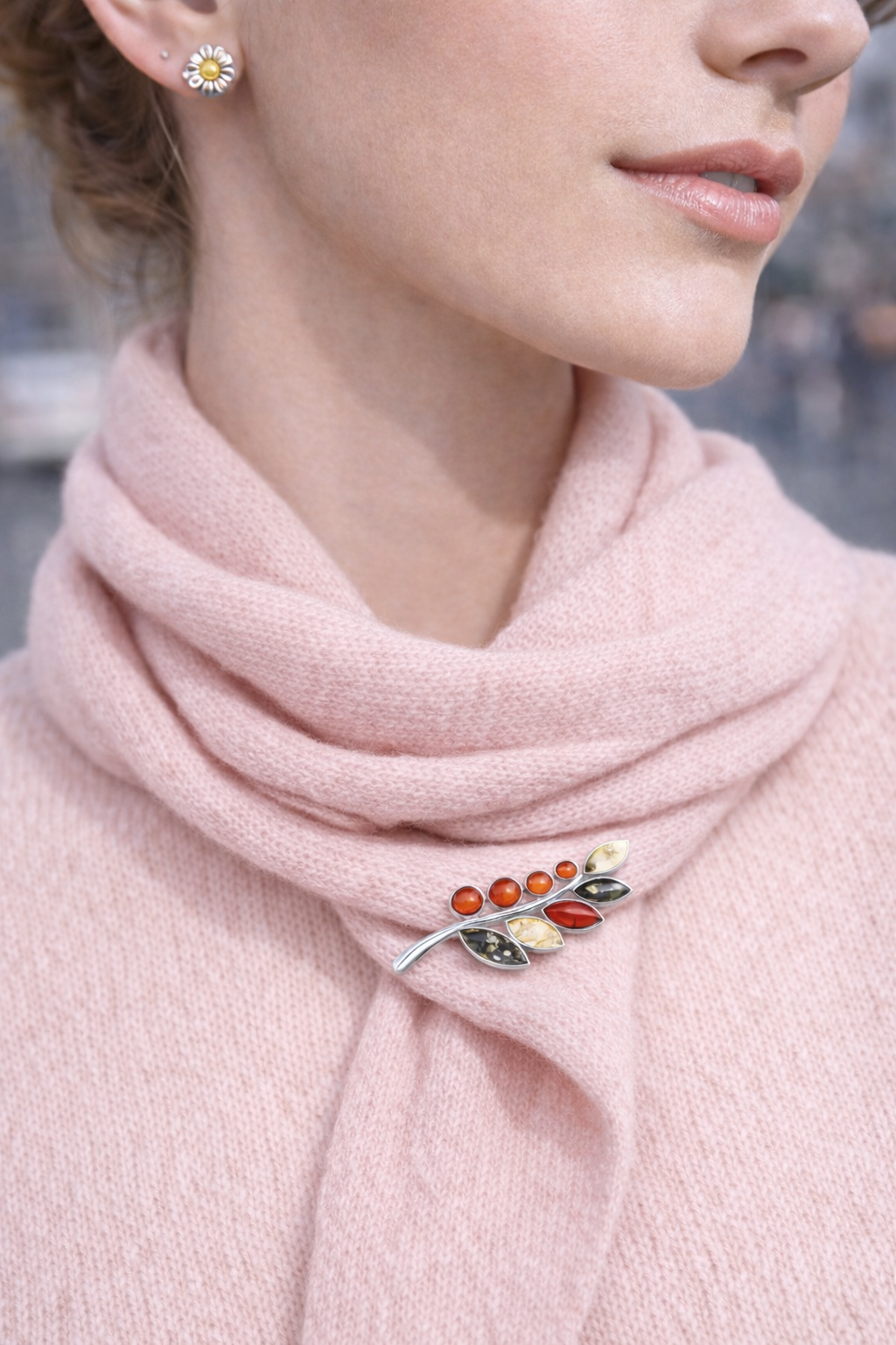 Crafted in 925 sterling silver, the piece features a delicate branch-like form adorned with multicolor natural Baltic amber stones — from warm honey and deep cognac tones to rich green and milky shades. Each stone is carefully set to create a harmonious, nature-inspired composition.