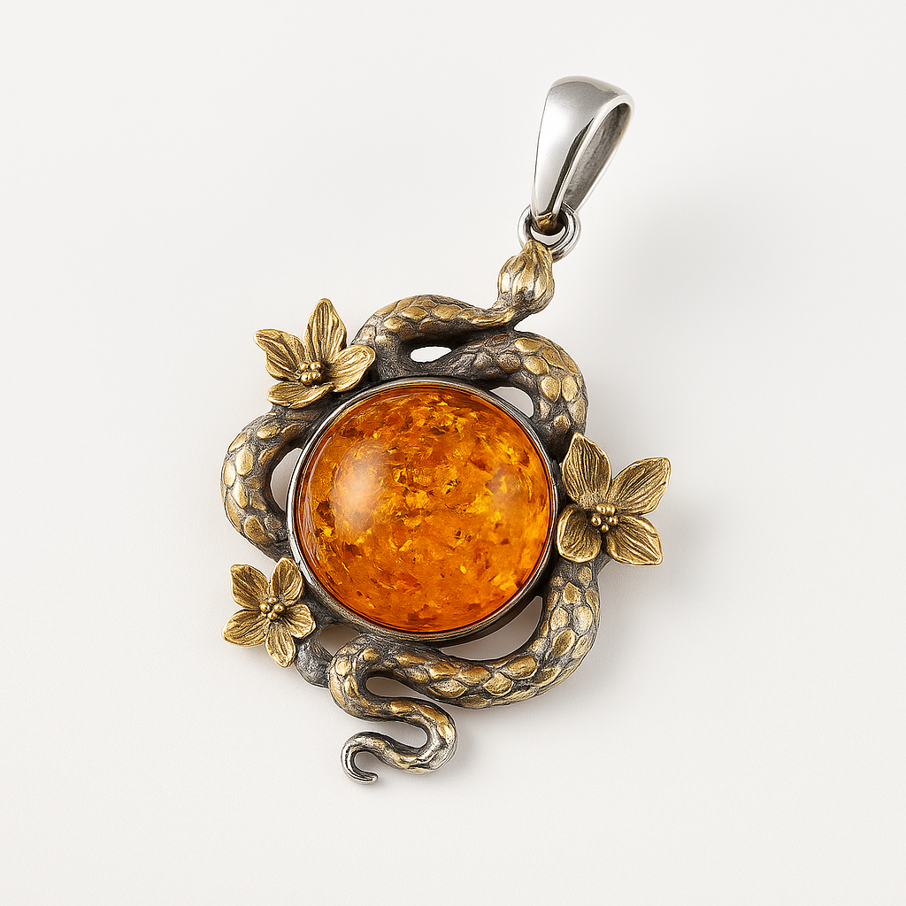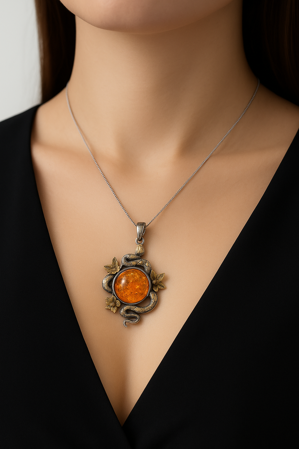Step into the Garden of Eden with this enchanting handcrafted pendant — a true masterpiece of artistry and symbolism. Eden features a radiant natural Baltic amber cabochon, glowing with golden light and warmth, set in 925 sterling silver with exquisite gold plating and oxidized detailing.