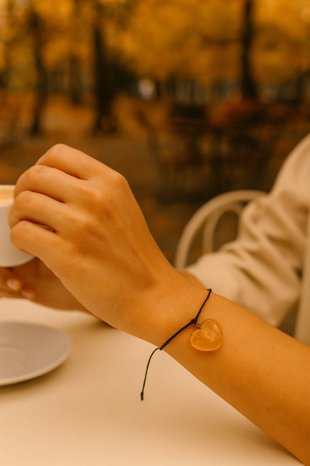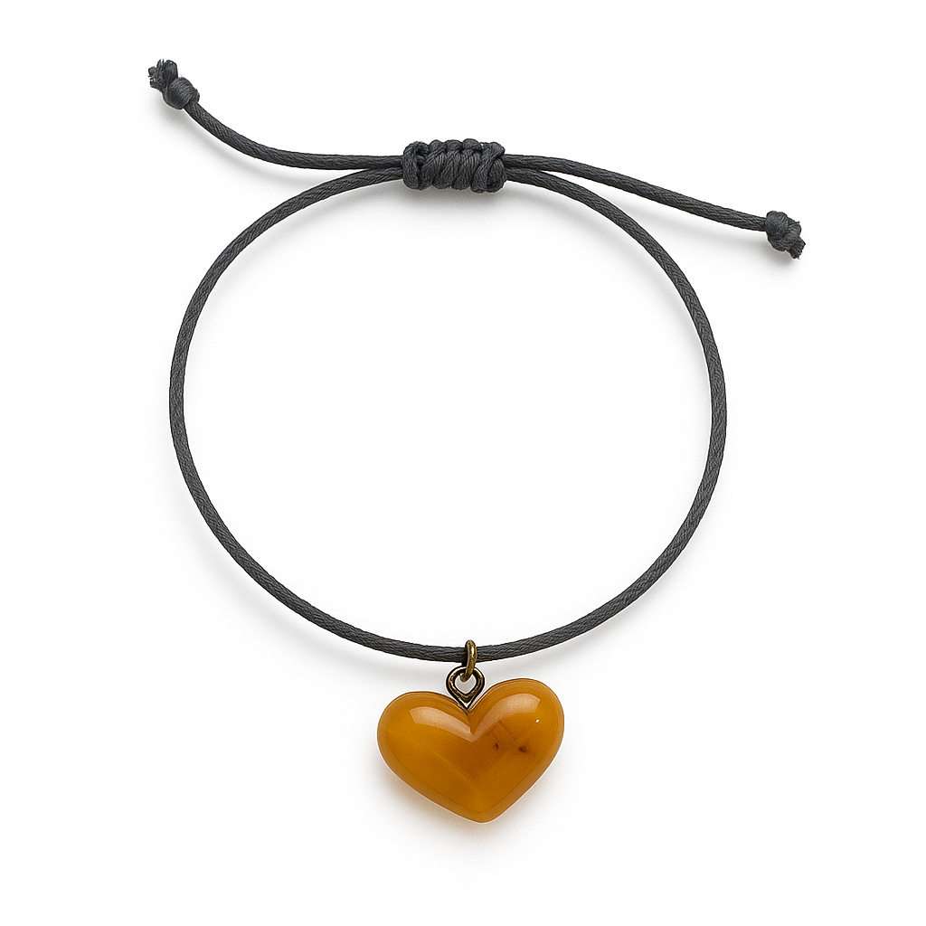Дизайн: минималистичный браслет с полированным янтарным сердечком на регулируемом шнурке — идеально подходит для повседневной носки или в качестве значимого подарка.