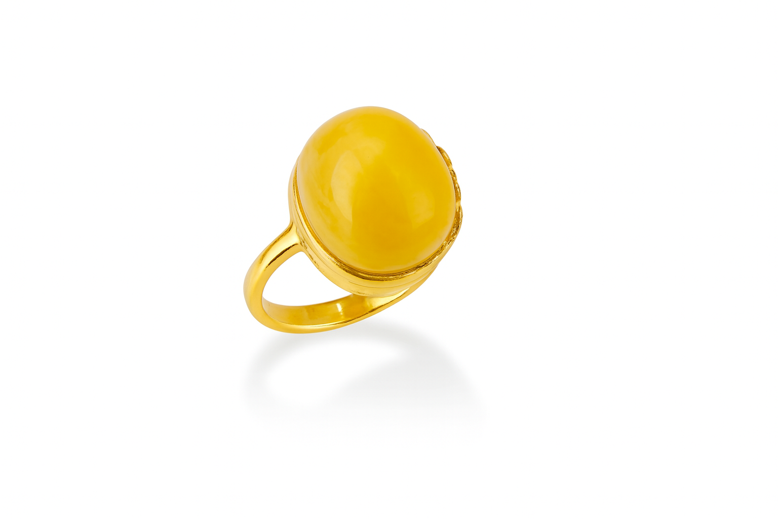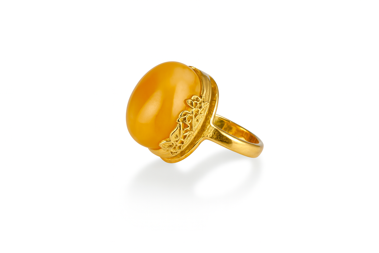 Эффектное украшение, излучающее тепло и элегантность. Это роскошное кольцо украшено крупным полированным кабошоном из балтийского янтаря медово-жёлтого цвета, обрамлённым замысловатым цветочным узором с позолотой. Гладкое бархатистое сияние янтаря и изысканная отделка создают королевский, вневременной образ. Идеально подходит для тех, кто ценит смелые украшения, сочетающие природную красоту и мастерство исполнения.