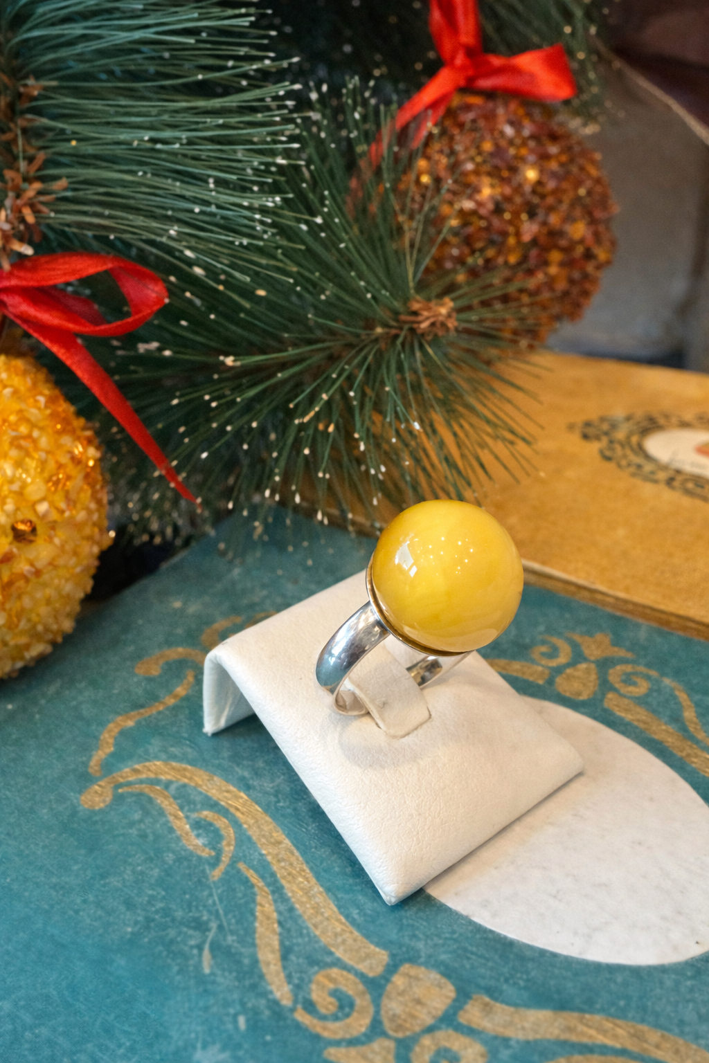 Это элегантное кольцо украшено гладким, натуральным шаром из балтийского янтаря диаметром 20 мм, излучающим теплый медово-желтый свет. Изготовленное из стерлингового серебра 925 пробы, кольцо отличается минималистичным и выразительным дизайном, благодаря чему янтарь остается истинным центром внимания.