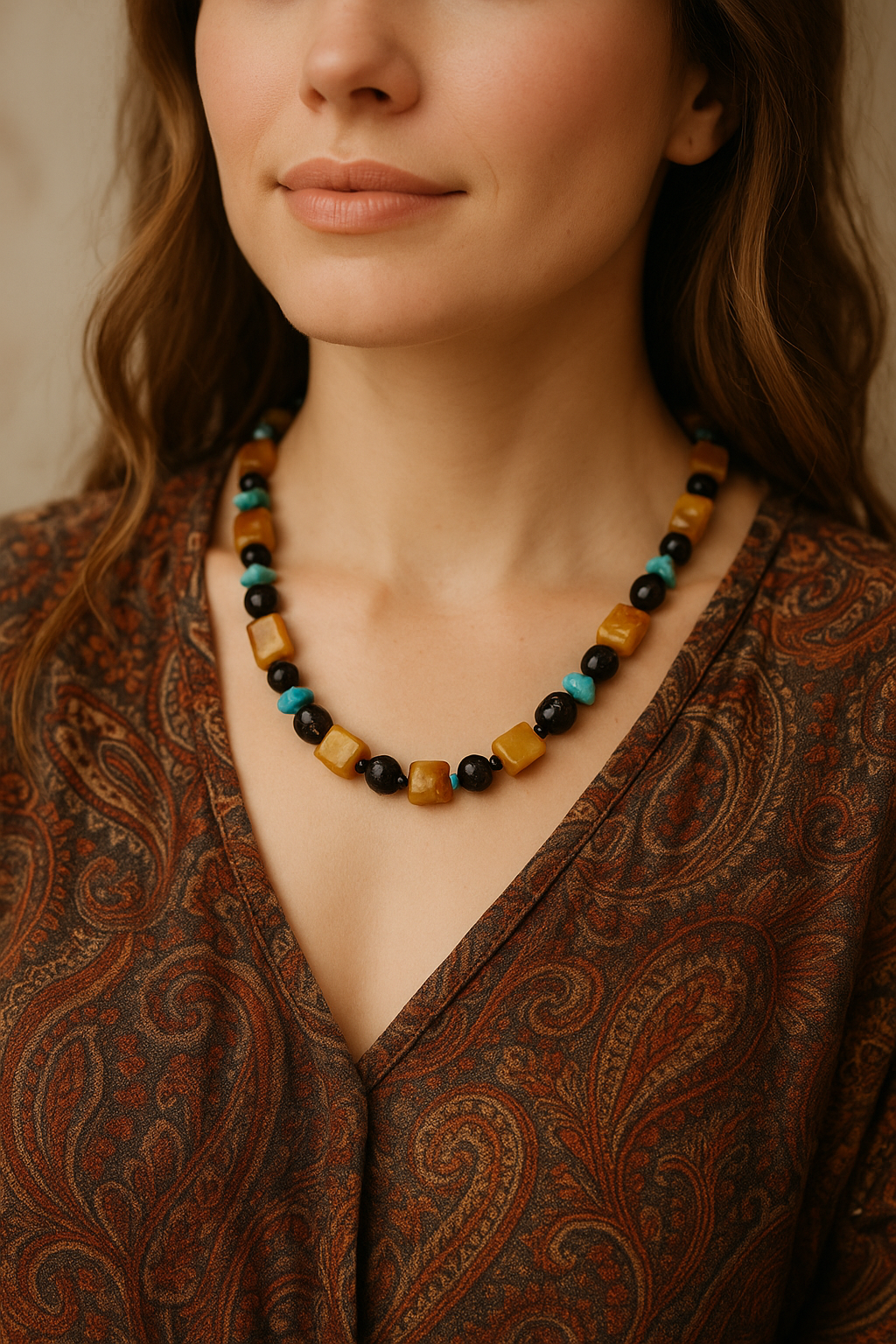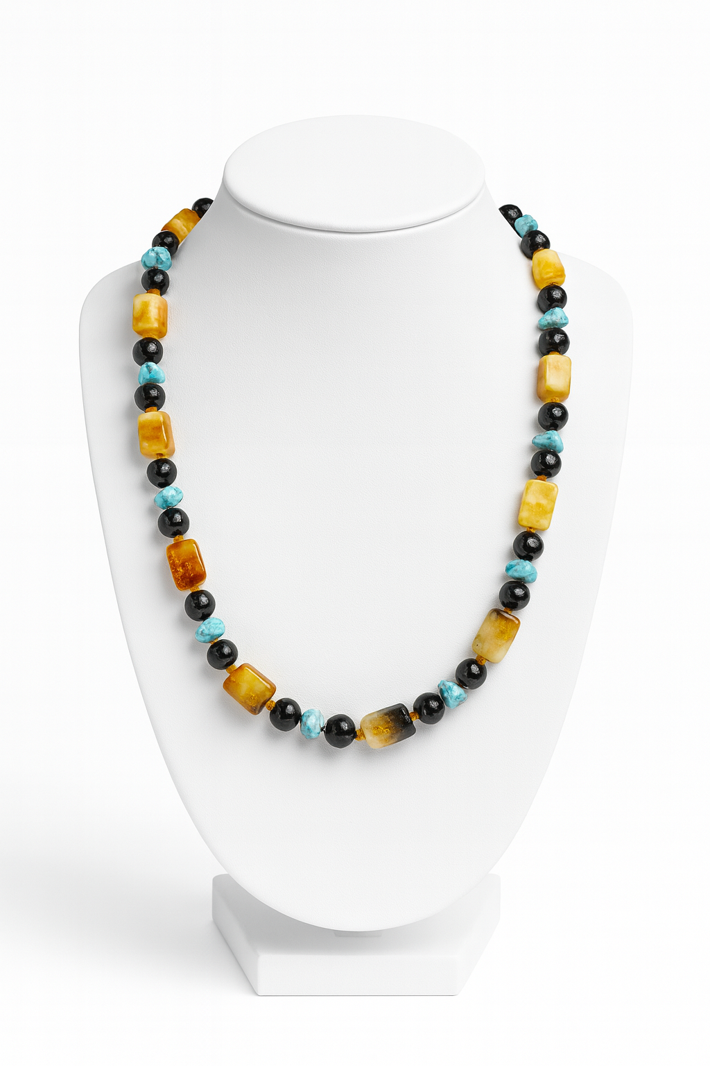 Теплое сияние балтийского янтаря элегантно сочетается с прохладным, освежающим характером бирюзы, что делает это колье привлекательным аксессуаром как для повседневной носки, так и для особых случаев.