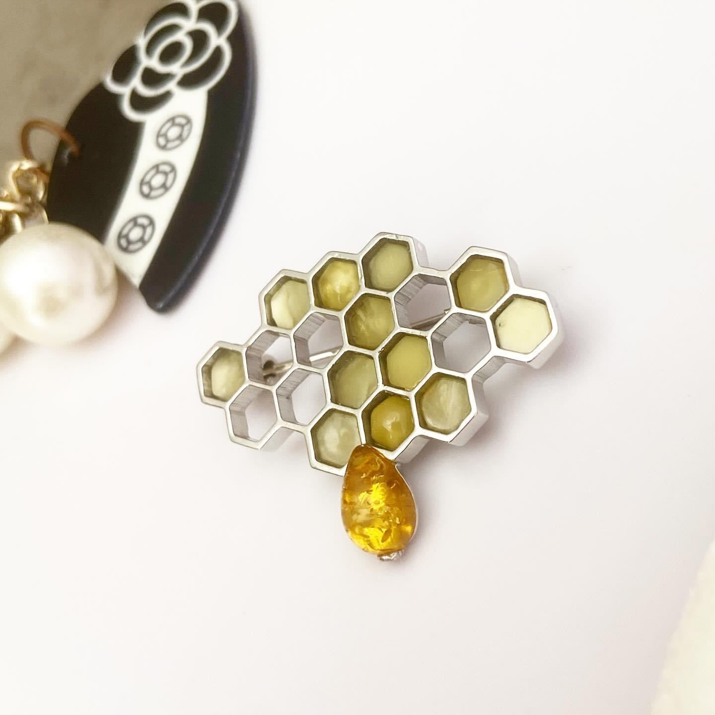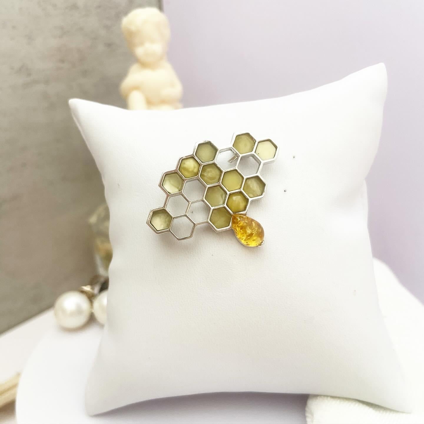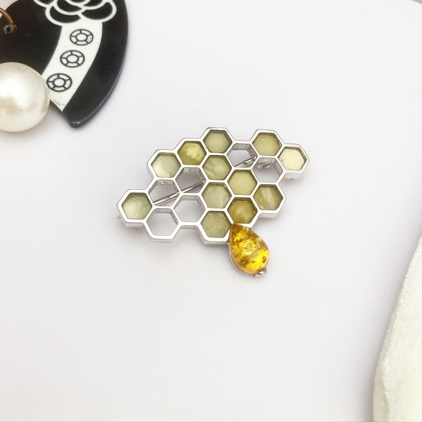 Брошь с янтарем "Соты"