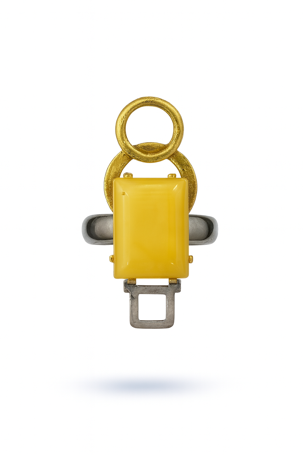 Design: Modern geometric ring handcrafted in silver and gold-plated accents, featuring a warm honey-yellow amber centerpiece