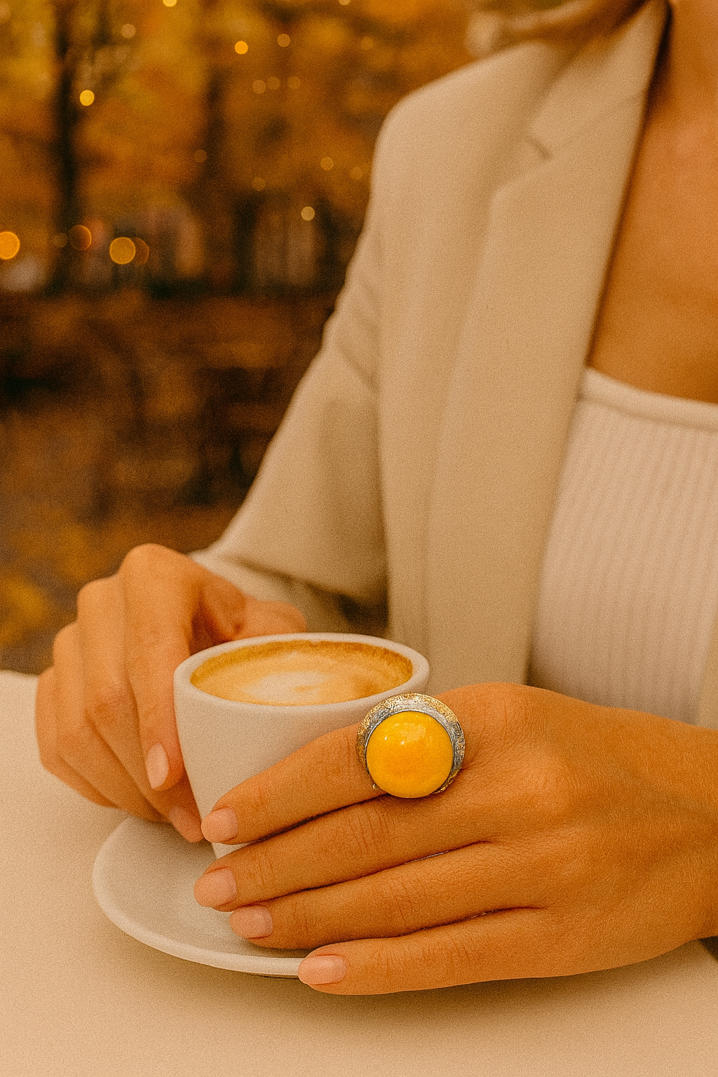 Дизайн: эффектное кольцо круглой формы с 3-сантиметровым кабошоном из янтарного камня цвета меда, обрамленным текстурированными акцентами из серебра и золота.