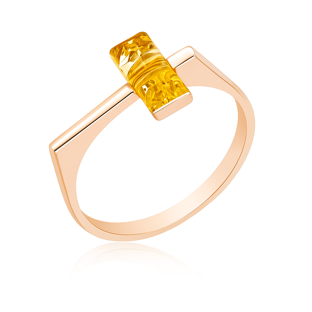 Изящное и современное кольцо для ценителей минималистичной элегантности. Центральным элементом служит прямоугольный кусочек натурального балтийского янтаря с уникальным внутренним узором, красиво переливающимся на свету.