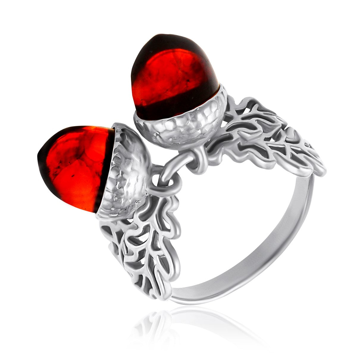 Сердцевину дизайна составляет кабошон из балтийского янтаря насыщенного вишнево-красного цвета, увенчанный фактурной шляпкой в виде желудя и дополненный изящным мотивом в виде дубового листа.