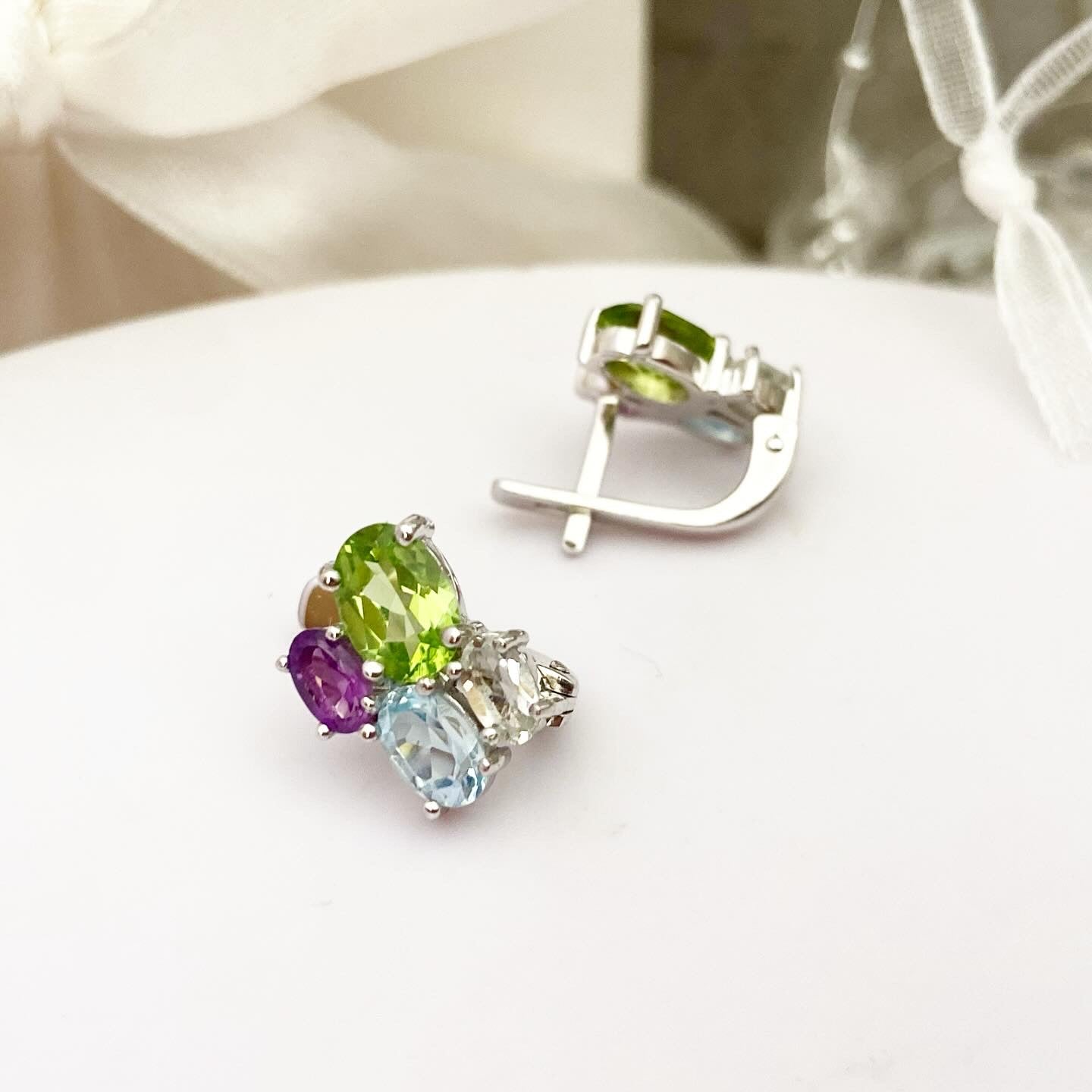 Элегантные серьги из серебра 925 пробы с ярким набором натуральных драгоценных камней: аметист, перидот, небесно-голубой топаз и швейцарский топаз.